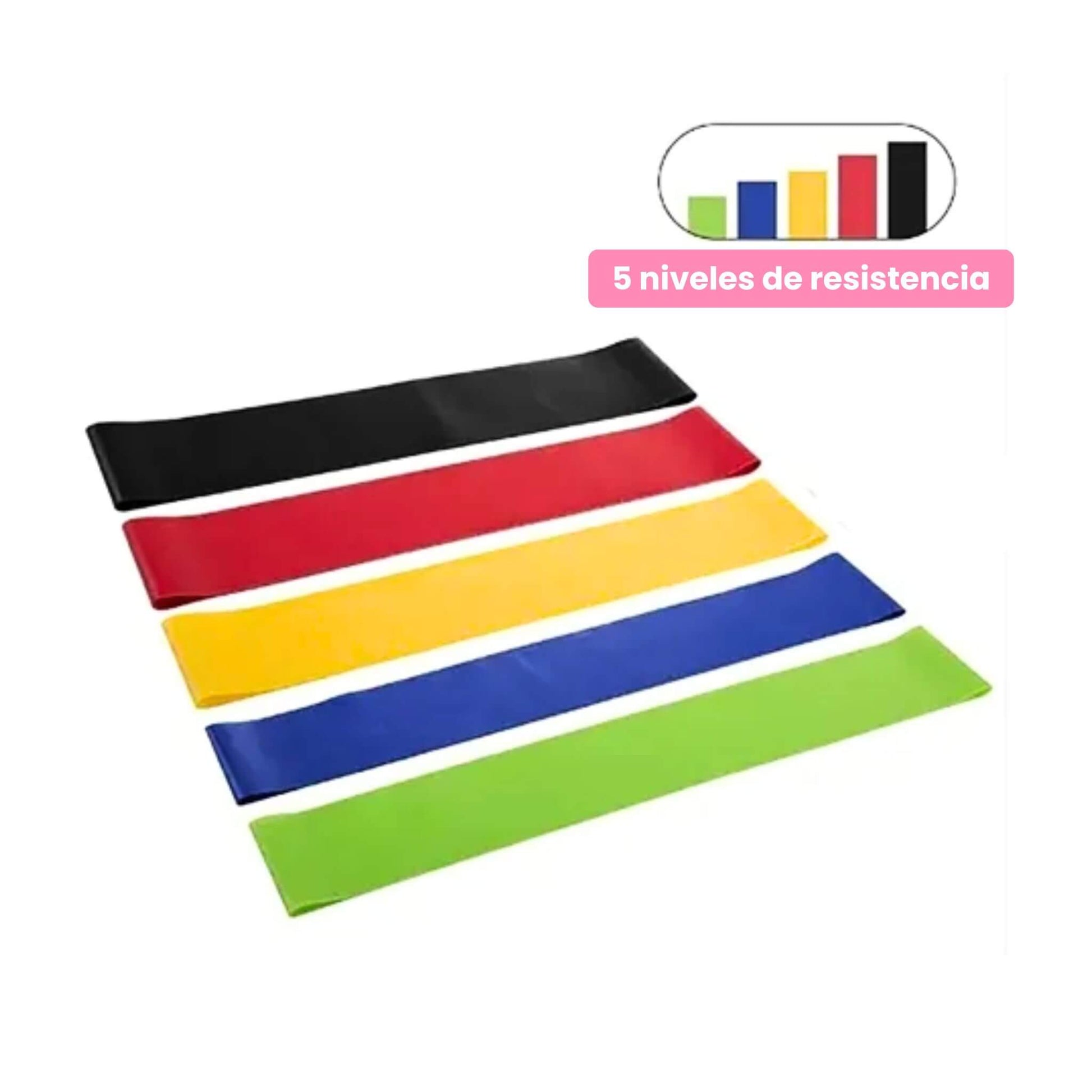 Entrena en casa, en el gimnasio o al aire libre con este set de 5 bandas elásticas de diferentes niveles de resistencia. Ideales para trabajar piernas, glúteos, cadera, brazos y más.